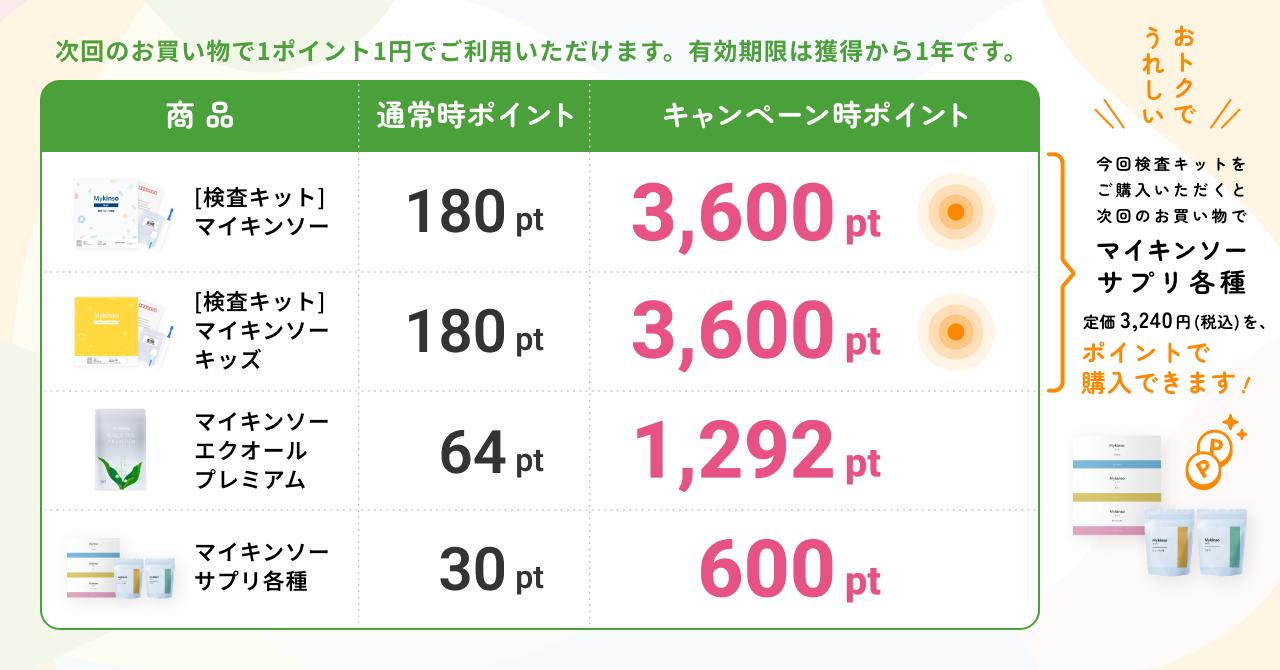 検査キット購入で、キャンペーン期間中は \20倍の3,600ポイント/ をプレゼントいたします。検査を受けたあと、ご自身の腸内フローラ結果に合わせておすすめされるサプリメントを、付与されたポイントで購入することも可能です。